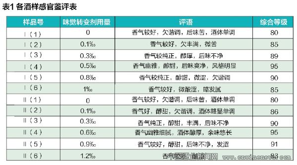 (2)隨著味覺轉變劑用量的增加,酒體的香氣、口感等愈來愈好,當達到某一程度后,隨著用量的增加,酒體的各方面感官情況開始愈來愈差,由此可見,當味覺轉變劑用量分別控制在0.5‰(Ⅰ型)和0.6‰(Ⅱ型)時,酒體將獲得最佳的感官質量。