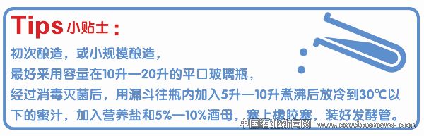 工業釀造在調配好的蜜汁中接種酒母以后,需要每天早晚兩次測定和記錄發酵醪的濃度和品溫,以了解發酵的進程,發現問題及時調整。小規模釀造,注意觀察二氧化碳氣泡的發生量和控制室溫即可。初次釀造,或小規模釀造,最好采用容量在10升—20升的平口玻璃瓶,經過消毒滅菌后,用漏斗往瓶內加入5升—10升煮沸后放冷到30℃以下的蜜汁,加入營養鹽和5%—10%酒母,塞上橡膠塞,裝好發酵管。發酵管球內倒上一點清水,起到過濾空氣的作用,以后注意在發酵管球內保持一定的水量。較大量的釀造,可采用陶瓷大缸進行發酵,用75%酒精擦抹缸內壁進行消毒,倒入調配好的蜜汁,接種酒母,缸上蓋一層紗布和一層塑料布。裝入缸內蜜汁的數量約為大缸容量的70%—80%。