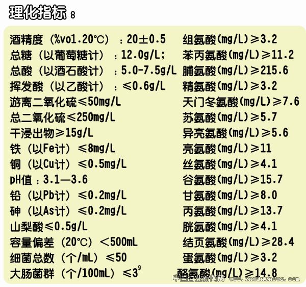 色澤:淡黃、琥珀色、深琥珀色、水白色。香氣純正、口味無異香。