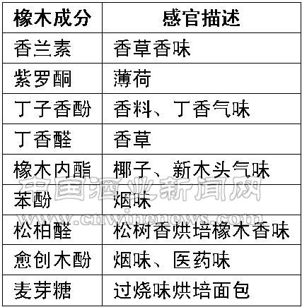 二、橡木成分與感官描述(見表)