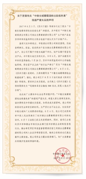 8月3日,多家媒體刊發了題為“中糧長城葡萄酒檢出致癌色素”的報道,其中提到“中糧長城葡萄酒業有限公司煙臺龍爵葡萄酒有限公司”生產的產品在蘇州市食藥監局等機關聯合檢查中被認定為不合格產品。