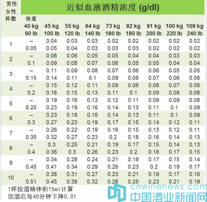 此公式非常復雜,飲酒量與血液酒精濃度的關系,還可參考下面這個直觀的表格:
