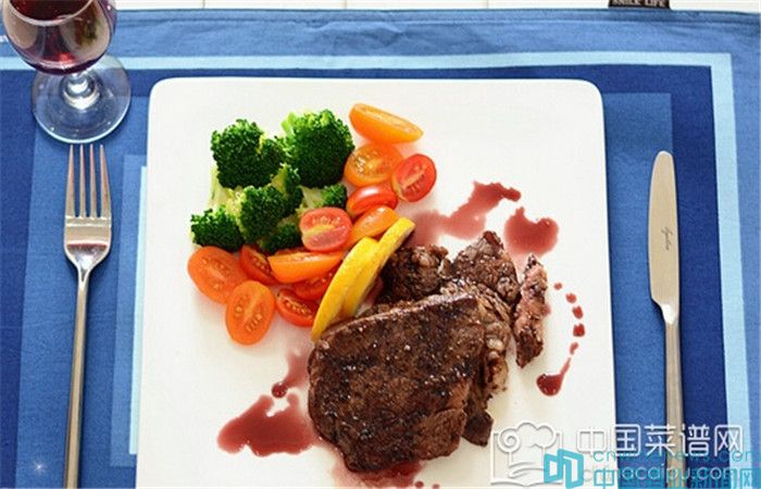 最后,盛上牛排,淋上紅酒汁,用蔬果裝點一下盤面就大功告成。