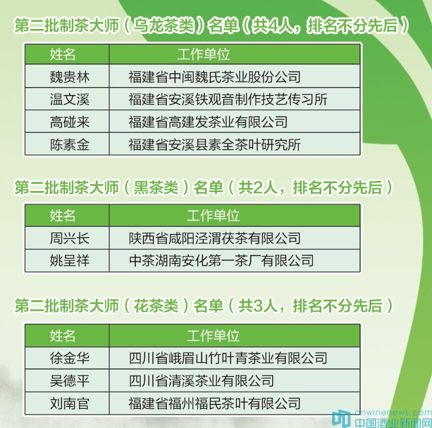 6月12日,中國茶葉流通協會發布消息,第二批制茶大師(烏龍茶類、黑茶類、花茶類)名單向社會公布。