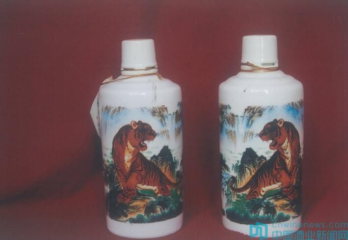 這酒是安徽中皖酒業(yè)有限公司出品的,是“擷林齋開業(yè)一周年紀(jì)念”酒,酒名是“十年家酒”。酒瓶是圓柱型,整體高19厘米,身周長25厘米,正面的一大幅畫面占19厘米。虎仿佛是在野外,看其身周圍,有山有水,有草有樹,自然環(huán)境優(yōu)美。兩虎協(xié)調(diào)得很好,左邊的虎轉(zhuǎn)身向右看,右邊的虎轉(zhuǎn)身向左看,兩虎動(dòng)作一樣。虎頭圓大,前額有似“王”字形斑紋,嘴大張著,全身黃毛,間有黑條紋,尾向上翹起,仿佛很興奮,很有氣勢(shì)。