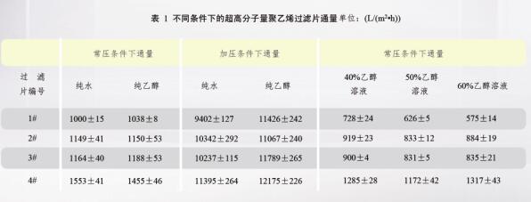 在0.2Mpa壓力條件下,純水與純乙醇在不同孔徑過濾片的通量如(表1)所示,2、3#過濾片的純水通量接近,1#的最小,4#的最大。2#過濾片的純乙醇通量最小,1#和3#的接近,4#最大。由此可知,與常壓下的通量結論一致的是4#過濾片的孔徑最大,其次為2#和3#,1#最小。值得注意的是:在加壓條件下,純水和純乙醇的流量均比常壓增大了10倍左右,且純乙醇的通量較純水的大,這可能是由于在外加壓力條件下,乙醇較水的滲透擴散性能加強。具體而言,0.2、0.3μm通量相差不大,0.2μm、0.3μm均與0.1μm的純水通量相差1000(L/(m2·h)),純乙醇通量相差不大,0.45μm與0.1μm的純水通量相差2000(L/(m2·h)),純乙醇通量相差約700(L/(m2·h))。