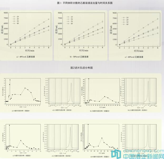 為填補業內研究空白,采用自制的通量測定裝置對不同孔徑酒用高分子過濾片進行流量實驗,再分別采用泡壓法和壓汞法對高分子過濾片孔徑大小及其分布進行了對比測定。由于高分子過濾片孔徑分布范圍較廣,使用壓汞法測定高分子過濾片的孔徑大小及分布比泡壓法更科學。此外,大孔的存在拉高了平均孔徑值,最可幾孔徑比平均孔徑更能科學和準確地反映酒用高分子過濾片的實際孔徑大小。