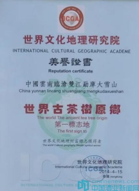 (圖:世界文化地理研究院頒發的“世界古茶山原鄉第一標志地”證)