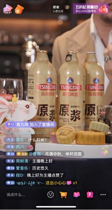從中秋團圓到親情保鮮,再講到一杯新鮮的青啤原漿,與這杯酒背后的人文情懷,這樣的直播方式無疑讓觀眾大呼新鮮。9月8日,青島啤酒在抖音平臺“青島啤酒官方旗艦店”進行了“月滿中秋 舉杯團圓 青啤原漿讓愛新鮮常伴”專場直播火了。