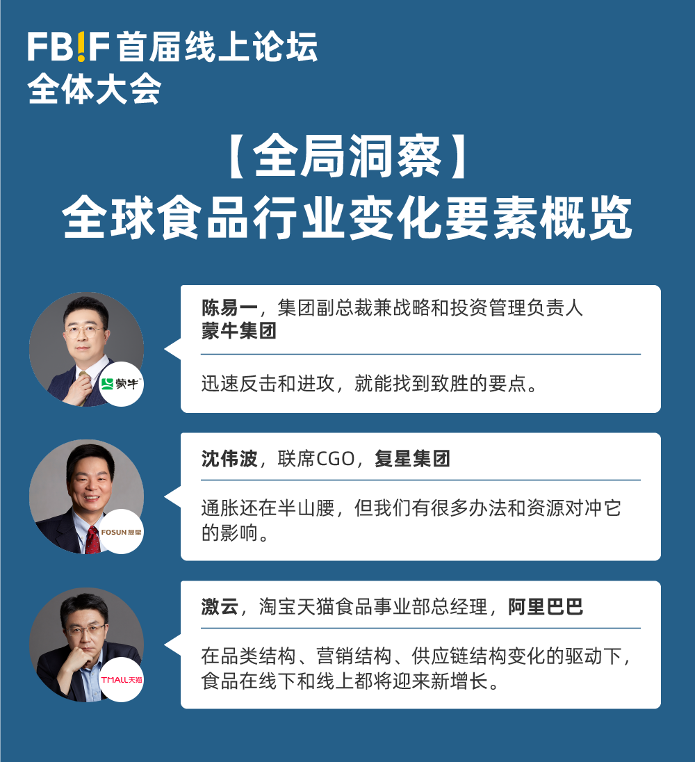 FBIF首屆線上論壇(2022)首日的全體大會至此已圓滿結束,但精彩仍將繼續!接下來4天的10個分論壇將正式開啟,內容覆蓋乳品、零食、烘焙、飲料、酒、調味品、預制菜等品類,及配料、營銷、渠道、供應鏈、包裝、創業等不同角度,將在11個直播間分別進行。您可掃描下方二維碼或點擊“閱讀原文”預約接下來的直播,同時歡迎您關注FBIF后續報道。