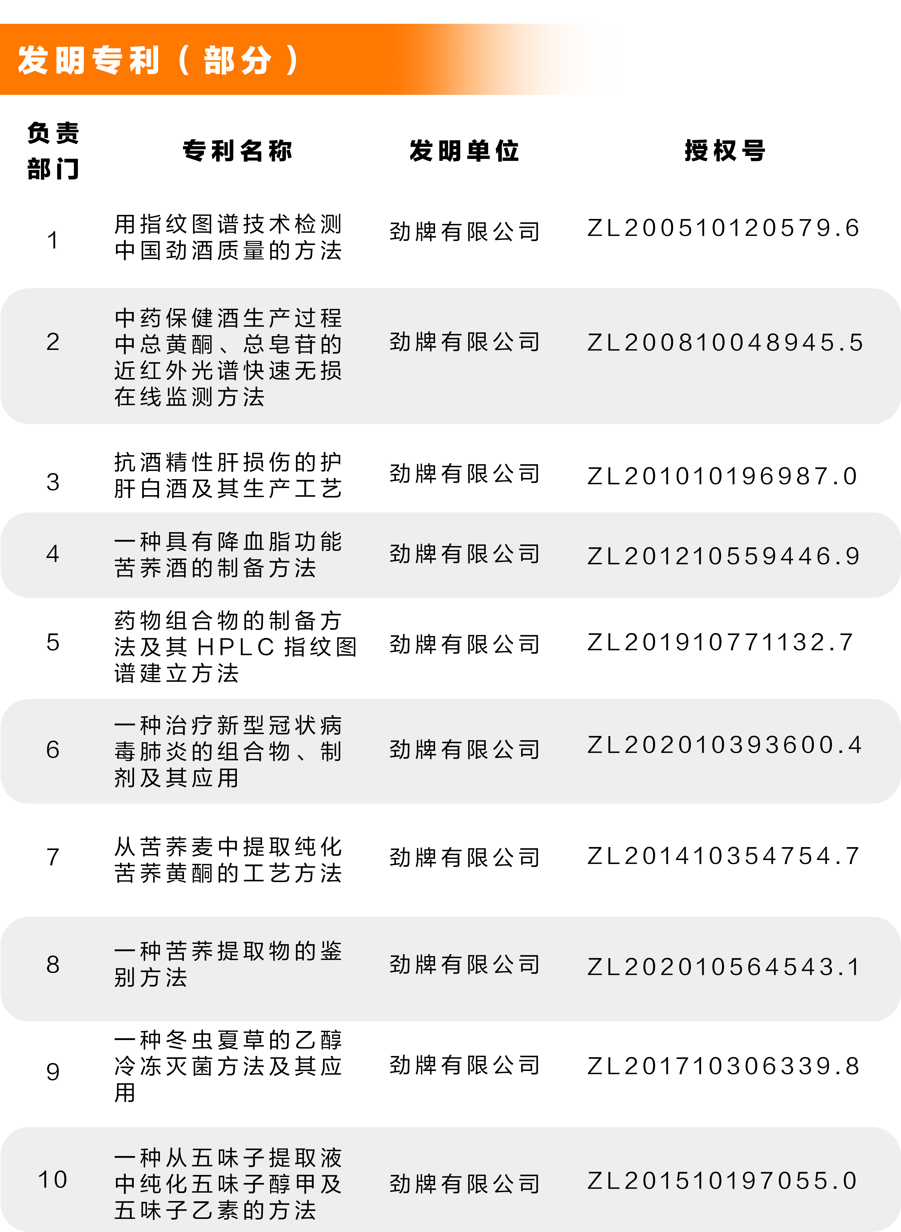 截至目前,勁牌公司擁有國(guó)家授權(quán)發(fā)明專(zhuān)利75件,被評(píng)為國(guó)家知識(shí)產(chǎn)權(quán)先進(jìn)示范單位。其中, “中國(guó)勁酒緩解體力疲勞主效成分群研究”“毛鋪苦蕎酒及其草本活性成分多途徑輔助減小肝損傷作用機(jī)制研究”等16項(xiàng)科技成果被鑒定為國(guó)際領(lǐng)先或國(guó)際先進(jìn)水平。