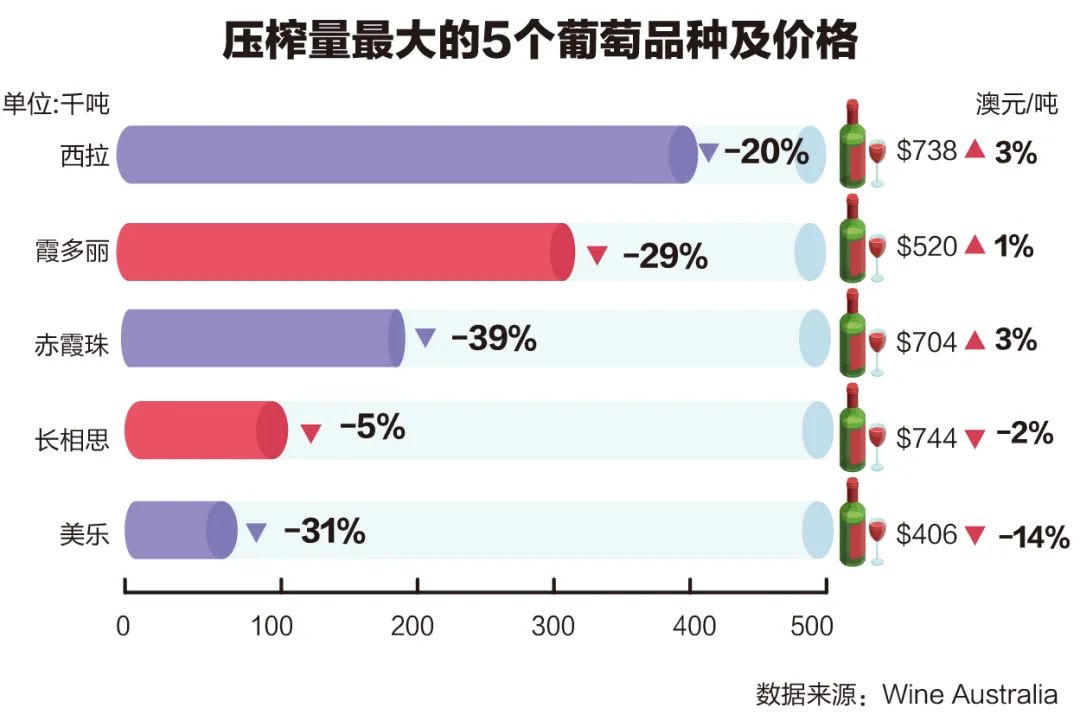 2023年紅葡萄品種的壓榨量估計(jì)為711777噸,比2022年減少26%,比10年平均水平943146噸低25%,而白葡萄品種的壓榨量估計(jì)為605321噸,比2022年減少22%,比10年平均水平839013噸低28%。西拉仍然是排名第一的葡萄品種,排在霞多麗、赤霞珠、長(zhǎng)相思和美樂(lè)之前。