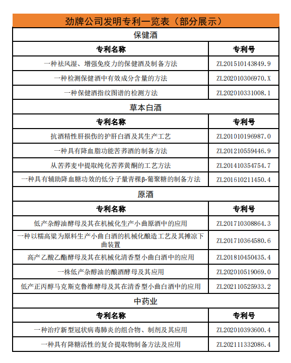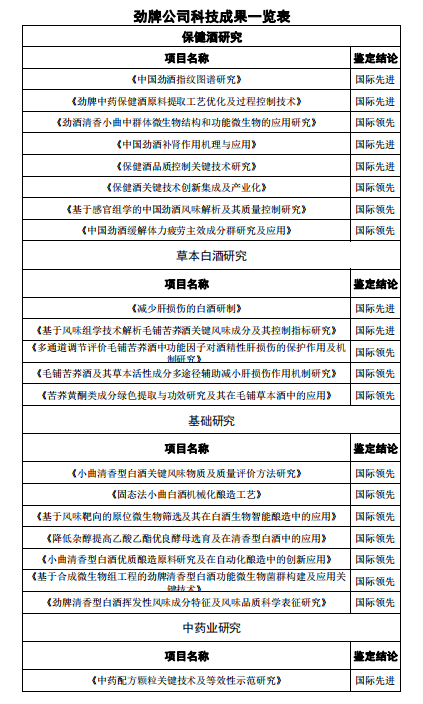 截至目前,勁牌共有21項科技成果被鑒定為達到“國際領先(先進)水平”,擁有110項國家授權發明專利,獲得國家級、省部級以上科技進步獎21項。