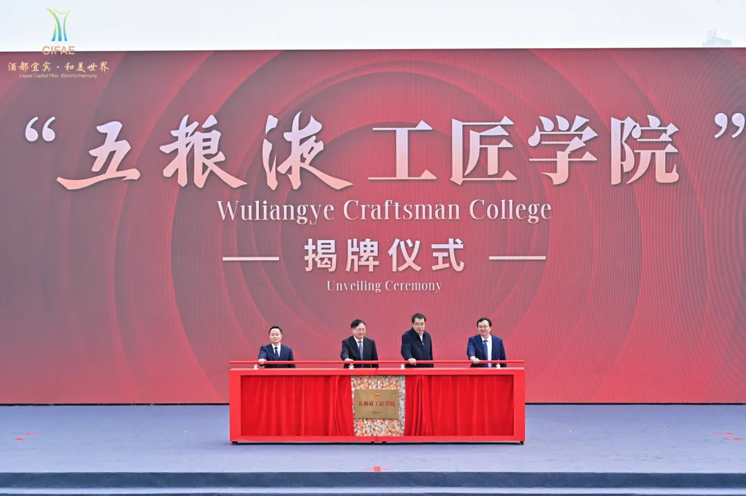 會議期間,由五糧液集團黨委書記、董事長曾從欽擔任院長的“五糧液工匠學院”揭牌成立。通過內部工匠與外部專家相結合的雙師團隊,以及線上線下學習、實操練兵等舉措,建立多元融合的育人矩陣,培養年輕釀酒人才。