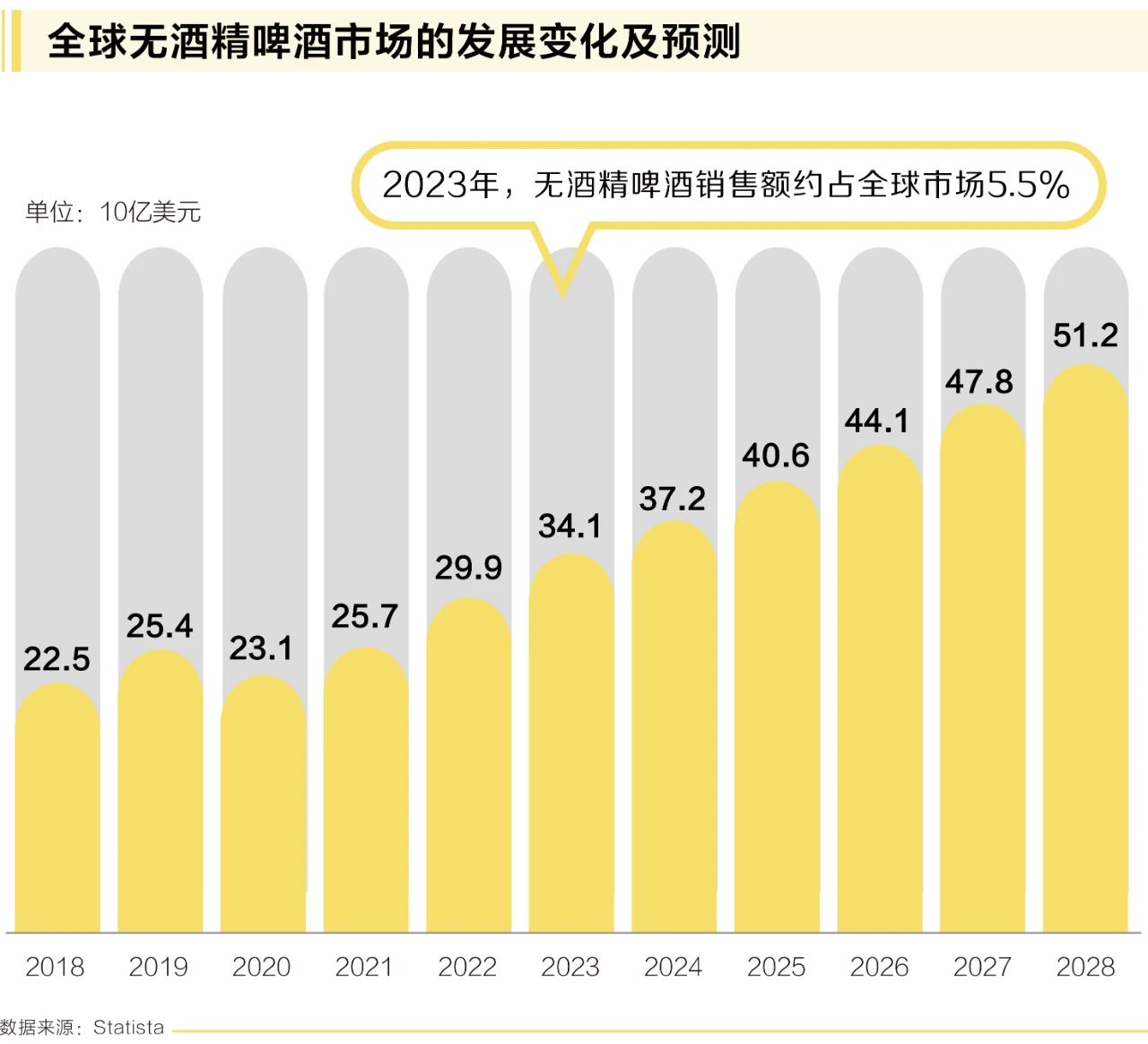 長期以來,無酒精啤酒被啤酒行業所忽視,現在被啤酒生產商視為一個機會,他們不斷擴大低酒精和無酒精啤酒的種類,以滿足不斷增長的客戶需求。世界第二大啤酒集團喜力最近在其年度報告中指出:“消費者越來越多地尋求健康和美味的選擇,在任何場合都可以享受低酒精或無酒精的飲品?!?/span>報告總結道:“隨著全球健康消費趨勢的持續,我們看到低卡路里和無酒精啤酒的美好未來。”如圖所示,基于Statist市場洞察的數據,無酒精啤酒細分市場在未來幾年將保持強勁增長。由于與新冠肺炎相關的封鎖和生活方式的改變,該行業在2020年遭受了一次小小的挫折,這對即飲領域造成了嚴重的打擊,之后該行業又回到了正軌,預計今年和未來幾年將實現穩健增長。Statista預計,到2028年,全球無酒精啤酒的銷售額將超過500億美元,是2020年的兩倍多。2024年,全球無酒精啤酒市場規模將達到370億美元,其中,非即飲渠道(如超市和便利店)無酒精啤酒的銷售額將達到189億美元;即飲渠道(如餐館和酒吧)產生的銷售額將達到181億美元。預計2024-2029年,非即飲渠道復合年增長率將達5.07%,其中美國最高,2024年將達到42.98億美元。