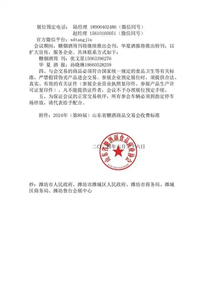 三、為保證會議籌備工作的順利進行,方便與各工商企業的聯系溝通,協會在濰坊魯臺會展中心設立了會務辦公室。需要預定展位和進行廣告宣傳的單位,請直接到魯臺會展中心聯系洽談(7月3日以后,辦公時間為8:30——12:00,14:30——18:00),也可通過電話、微信等方式聯系預定。展位預定電話:陸經理 18906402486(微信同號)趙經理 15610160051(微信同號)官方微信平臺:sdtangjiu