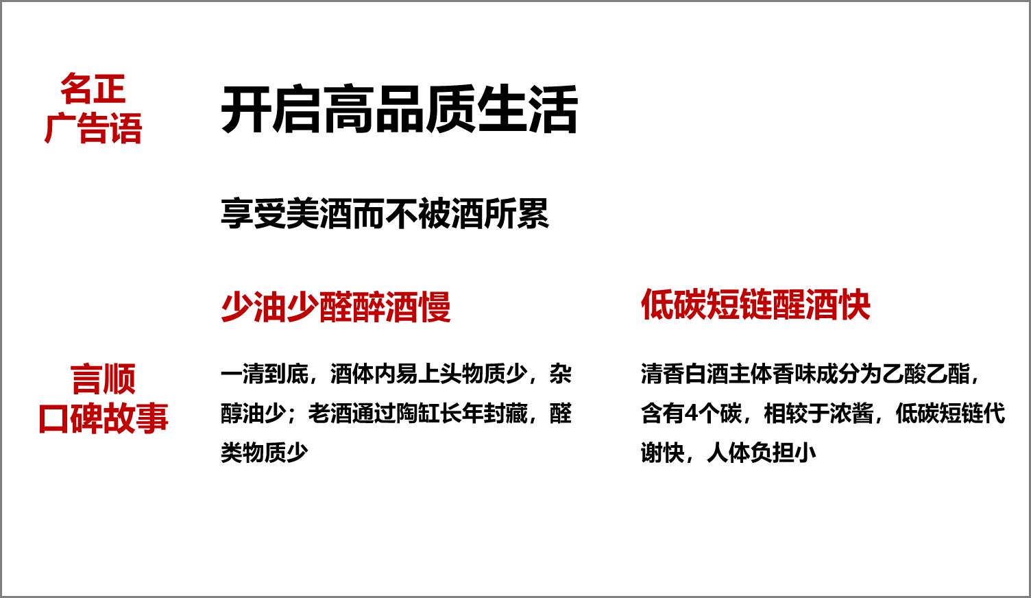 所有用戶關心的都是與自己有關的“利益點”,生理可體驗、邏輯可證明的品質是“果”,分為飲前聞香、飲中入口、飲后體感;帶給消費用戶的每個“利益點”必定有相應的支撐點,這是“因”,因果要一一匹配,成雙成對出現,形成邏輯自洽,此謂“因果自洽”(以青花汾酒為例)。