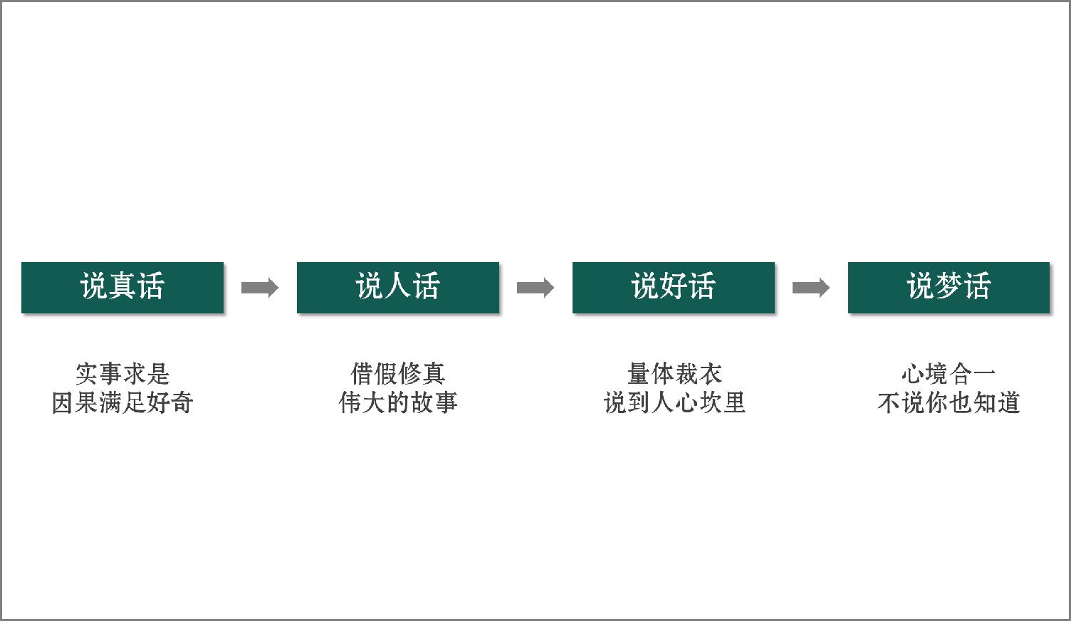 將技術語言轉化為消費者語言需要四次翻譯,第一次“翻譯”:與技術體系的對話,找到令人信服的價值依據,講真話;第二次“翻譯”:根據市場消費者的需求,將第一次的價值挖掘,翻譯成消費用戶喜聞樂傳的“人話”;第三次“翻譯”:根據競爭對手的特點和用戶認知水平,找到針對性的話術故事,說好話;第四次“翻譯”:將品質價值和精神價值轉化為帶有感染力的場景,如夢如幻,說夢話。