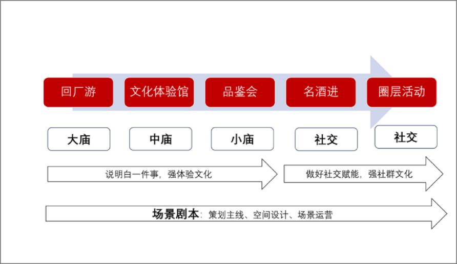 場景沒有劇本,就如同人沒有靈魂、手機沒有芯片,用戶教育常見的三級體驗場景(回廠游、體驗館和品鑒會)和兩大社交場景(社群活動、名酒進名企),需要價值明確、言之有物的劇本故事,劇本故事離不開前期的價值挖掘。