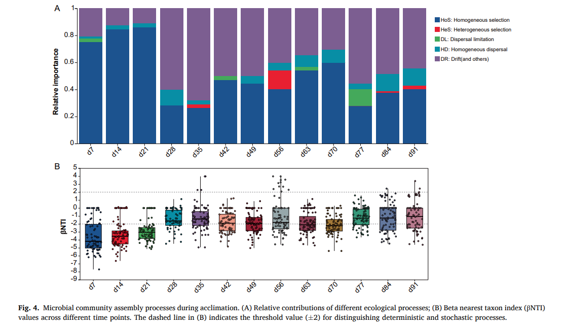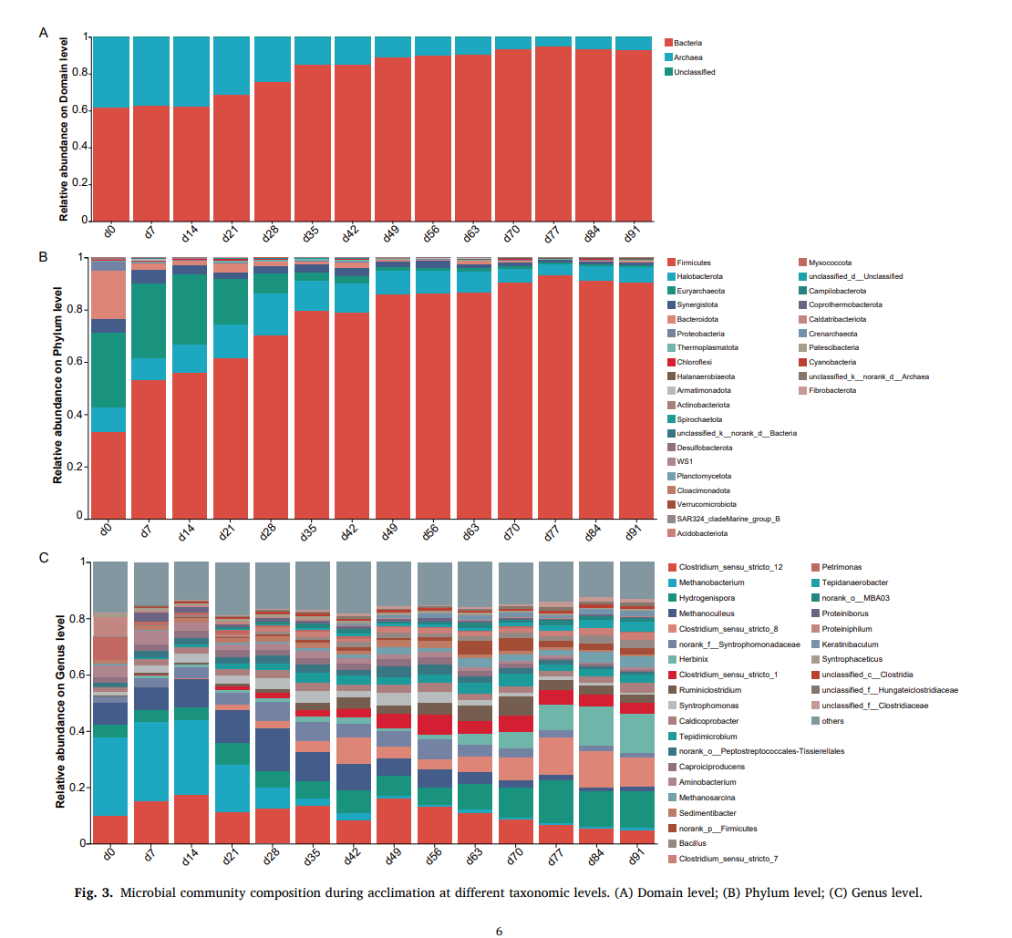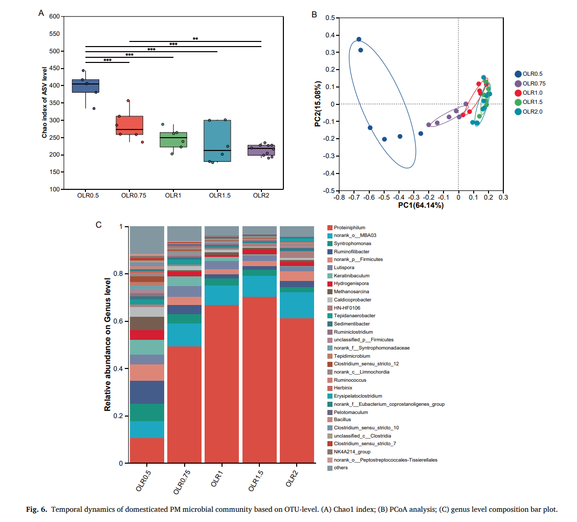 方法論創(chuàng)新:采用“自上而下”的窖泥微生物群落定向篩選與功能進(jìn)化策略,首次利用釀造系統(tǒng)中自然形成的窖泥菌群作為起始接種體,通過(guò)高溫干式馴化與中溫連續(xù)培養(yǎng)相結(jié)合,實(shí)現(xiàn)了微生物群落結(jié)構(gòu)從Firmicutes絕對(duì)主導(dǎo)到Bacteroidota/Firmicutes協(xié)同的關(guān)鍵轉(zhuǎn)變,成功構(gòu)建耐負(fù)荷、高恢復(fù)力的合成菌群,構(gòu)建了高效的酒糟厭氧消化反應(yīng)器微生物機(jī)制解析:研究揭示了窖泥源微生物在厭氧消化過(guò)程中的群落組裝機(jī)制(由確定性選擇轉(zhuǎn)向隨機(jī)漂移),并發(fā)現(xiàn)Proteiniphilum等蛋白降解菌及潛在乙酸氧化菌norank_o_MBA03的關(guān)鍵功能,為復(fù)雜生物質(zhì)原料高效厭氧消化提供了新的微生物理論依據(jù)。