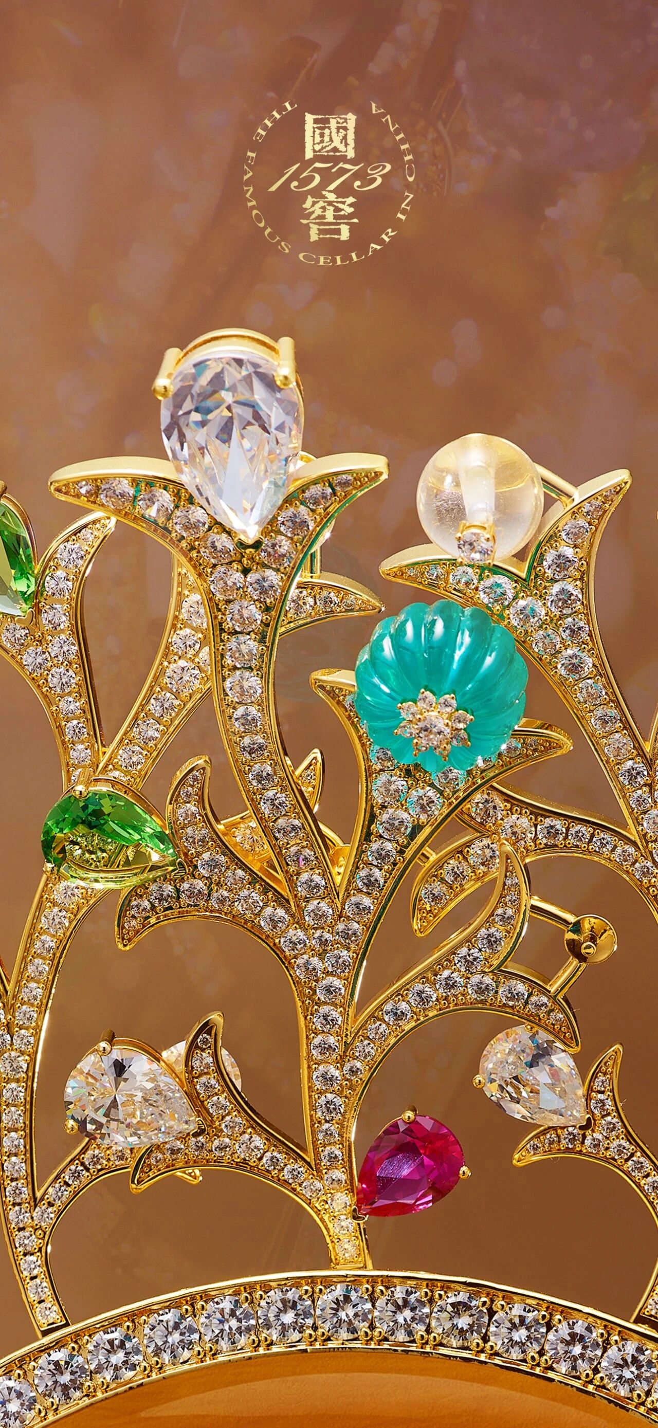 “人間桂樹”以金屬鍛造的金桂枝干,鑲嵌鋯石露珠,暗合“桂子月中落”的深遠(yuǎn)意境。桂樹寓意中秋福貴團(tuán)圓,亦隱喻國窖1573繁盛不息的生命力;寶石露珠如酒露凝香,彰顯“天地同釀 人間共生”的哲學(xué)智慧。