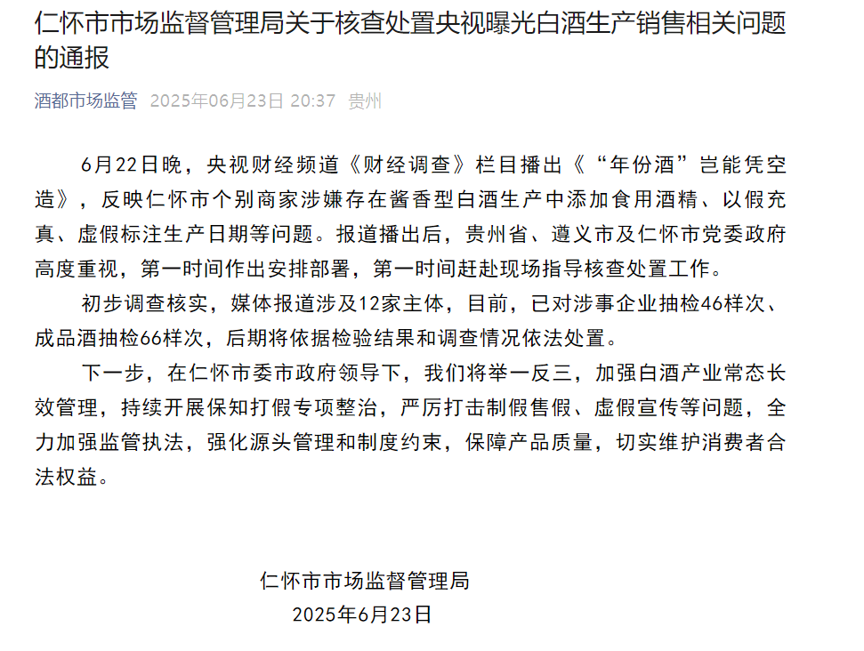 《通報》顯示,6月22日晚,央視財經(jīng)頻道《財經(jīng)調(diào)查》欄目播出《“年份酒”豈能憑空造》,反映仁懷市個別商家涉嫌存在醬香型白酒生產(chǎn)中添加食用酒精、以假充真、虛假標注生產(chǎn)日期等問題。報道播出后,貴州省、遵義市及仁懷市黨委政府高度重視,第一時間作出安排部署,第一時間趕赴現(xiàn)場指導核查處置工作。初步調(diào)查核實,媒體報道涉及12家主體,目前,已對涉事企業(yè)抽檢46樣次、成品酒抽檢66樣次,后期將依據(jù)檢驗結(jié)果和調(diào)查情況依法處置。