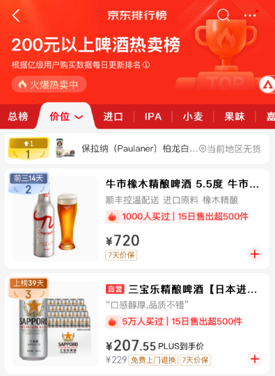 京東、天貓等電商平臺數據顯示,牛市啤酒上線后,迅速沖入啤酒類銷售榜單前列,成為當前最受歡迎的啤酒品牌之一。據京東商智統計,8月1日至8月13日期間,牛市啤酒成交金額高居京東啤酒品牌首位;8月27日,該品牌位列京東“200元以上啤酒熱賣榜”第二,并已連續15天穩居前三。另據天貓生意參謀統計,上市當天,牛市啤酒斬獲天貓平臺啤酒品牌銷售額第一。
