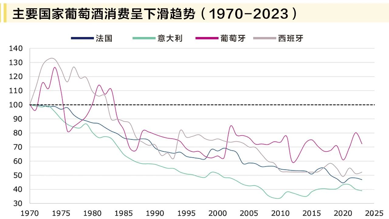 荷蘭合作銀行(Rabobank)飲品研究副總裁Bourcard Nesin以一張圖表揭開序幕:葡萄牙、西班牙、法國、意大利四國過去55年的葡萄酒消費(fèi)曲線持續(xù)下行,當(dāng)前消費(fèi)量僅為1970年的一半,而同期人口增長30%。“出口市場曾是美國市場規(guī)模翻倍的救命稻草,但增長早在10年前停滯。”他直言,2008年金融危機(jī)后的平緩期在2017年急轉(zhuǎn)直下,“如今,我們面對的是結(jié)構(gòu)性衰退,而非周期性波動。”